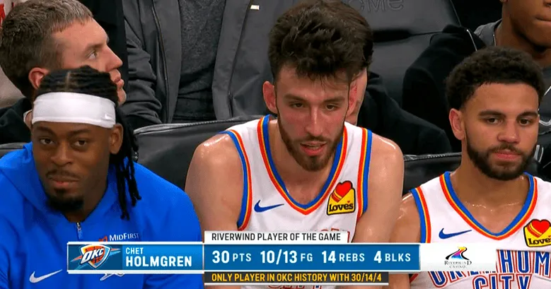 转播方列出数据,霍姆格伦拿到30分14篮板4盖帽,成为雷霆队史首个拿到此数据的球员。